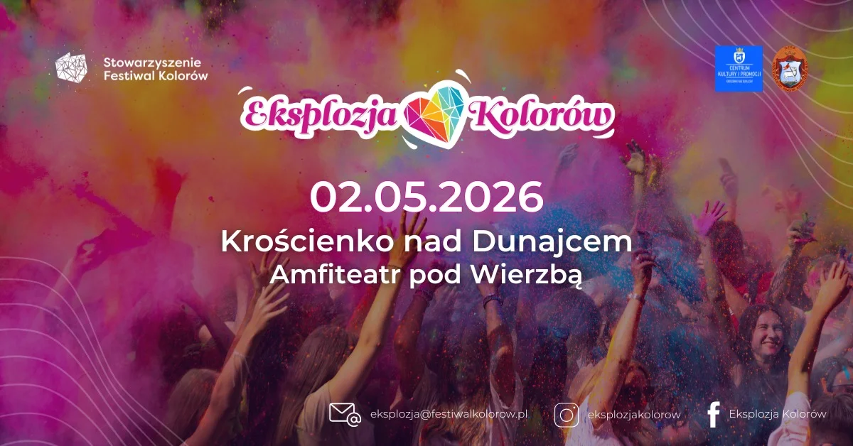 Krościenko nad Dunajcem znów zrobi się naprawdę barwne 2 maja przy Amfiteatrze „Pod Wierzbą” pojawi się Eksplozja Kolorów – luźna, wesoła impreza, która zamienia zwykłe popołudnie w morze kolorów i dobrej energii. Wstęp jest bezpłatny, więc to jeden z tych terminów, które łatwo wpadają do planu całej okolicy.