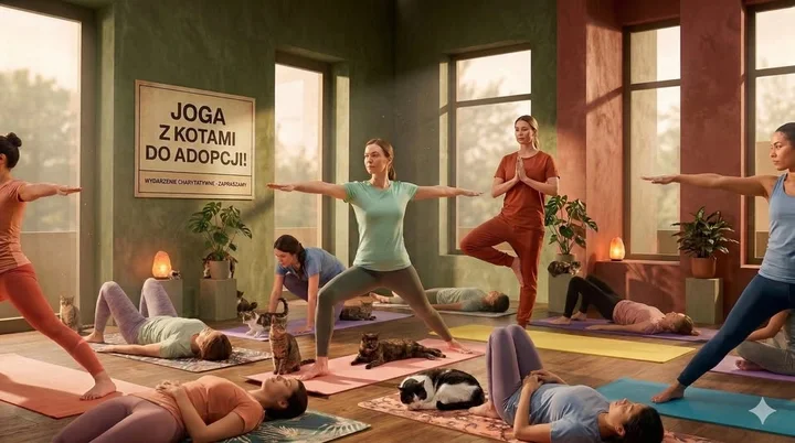 - Sesja trwa około godziny — elementy rozciągania, oddechu i relaksu, z towarzystwem mruczących gości.
