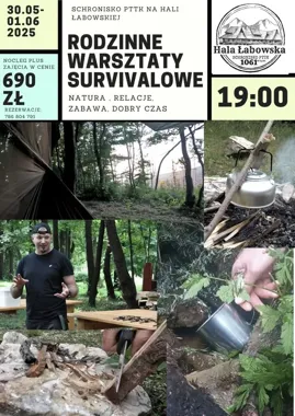 Dwudniowe rodzinne warsztaty praktycznych umiejętności przetrwania w terenie prowadzone w okolicach schroniska na Hali Łabowskiej. Zajęcia obejmują budowę schronienia, rozpalenie ognia tradycyjnymi metodami, pozyskiwanie i uzdatnianie wody oraz orientację w terenie bez użycia GPS. Program jest kierowany do rodzin i dostosowany do różnych poziomów zaawansowania uczestników.