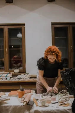 Na warsztatach projektujemy, lepimy i szkliwimy tabliczki — od prostych, monochromatycznych form po wielobarwne, stemplowane i dekorowane reliefami wersje. Będą techniki rzeźbienia, stemplowania i pracy z gliną, a po zaschnięciu tabliczki zostaną wypalone, więc efekt będzie trwały i odporny na warunki atmosferyczne.